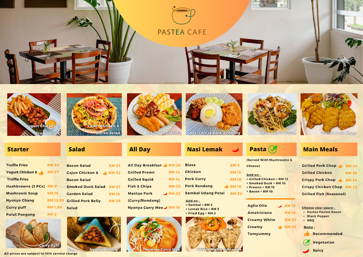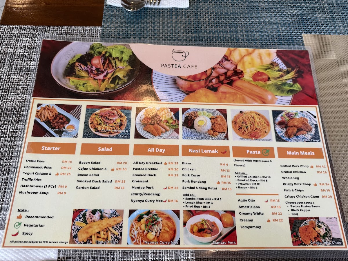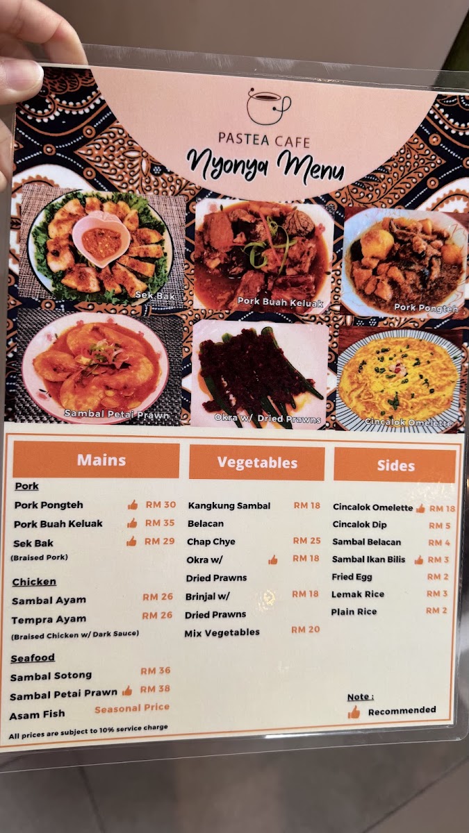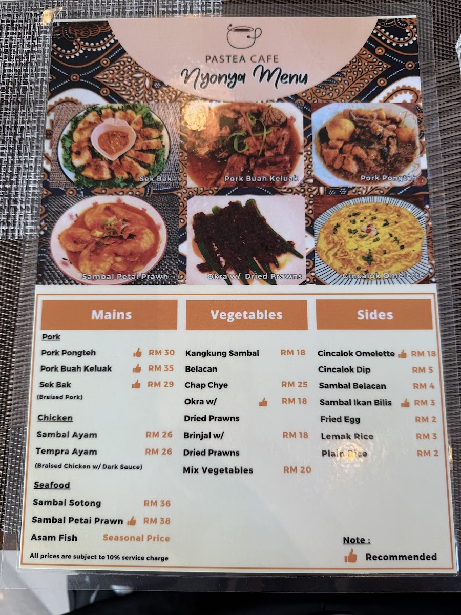 - Food: The menu features traditional Nasi Lemak options served with various accompaniments such as pork curry, pork rendang, prawn sambal with petai, and marinated yogurt chicken. There are also light bites and starters including garlic bread, mushroom soup with garlic bread, Pulut Panggang, curry puffs, and Nyonya Bak Chang.