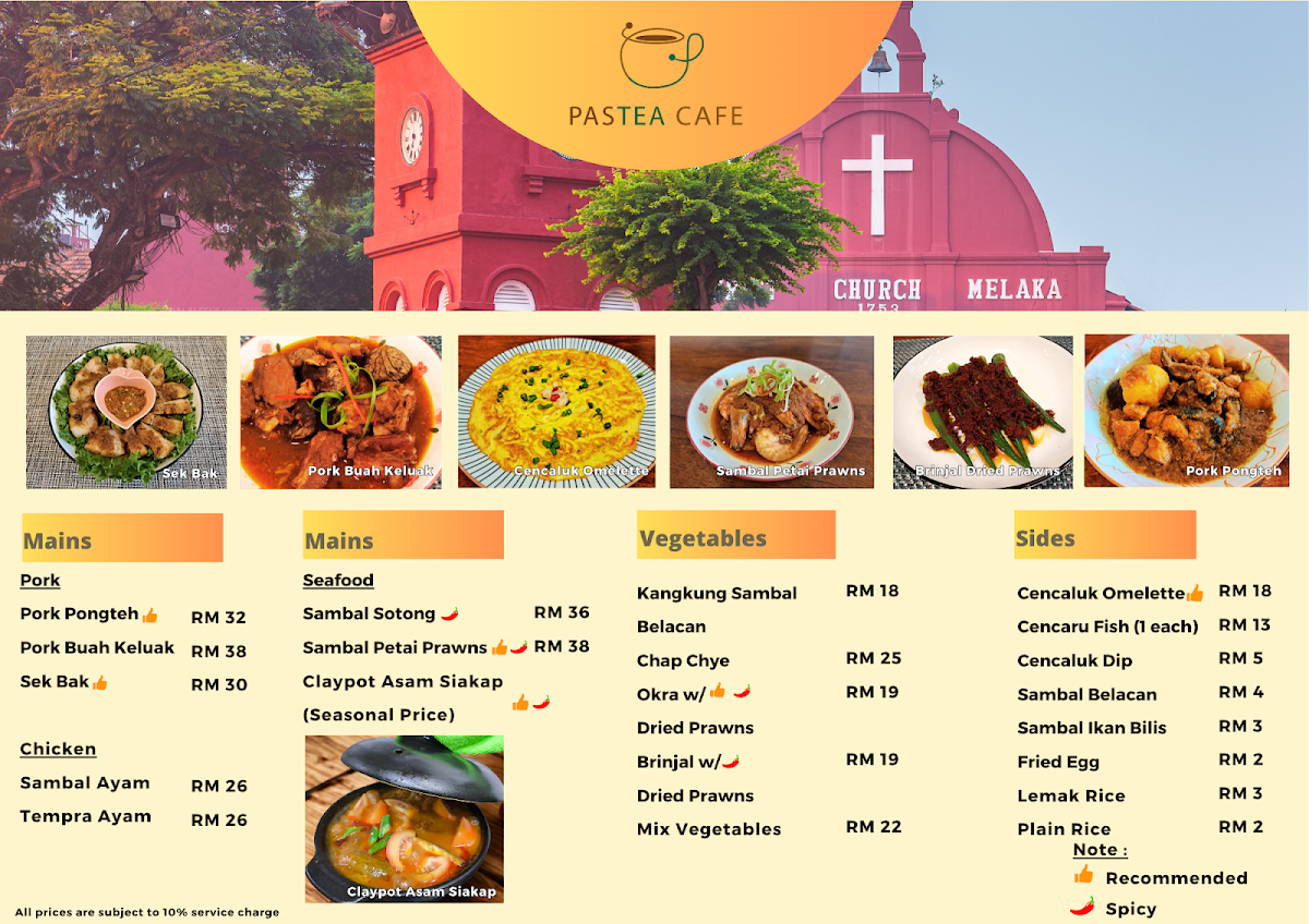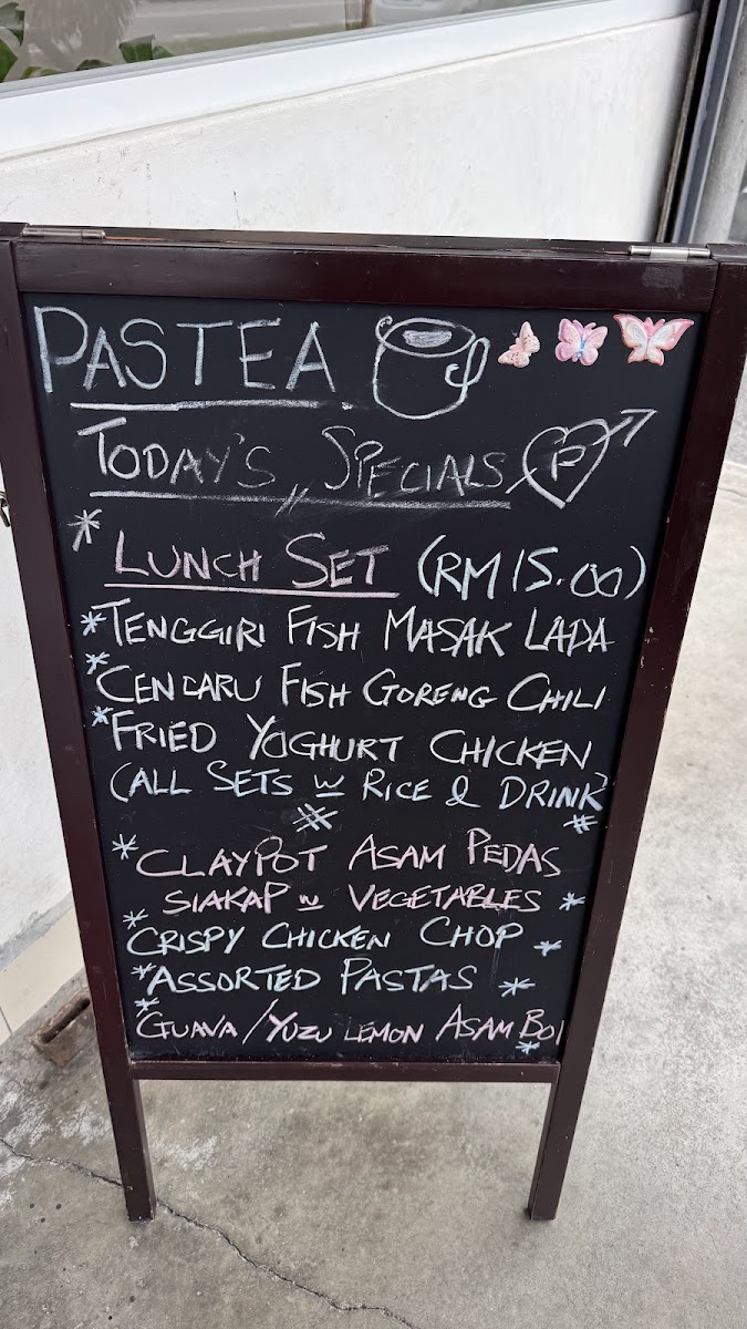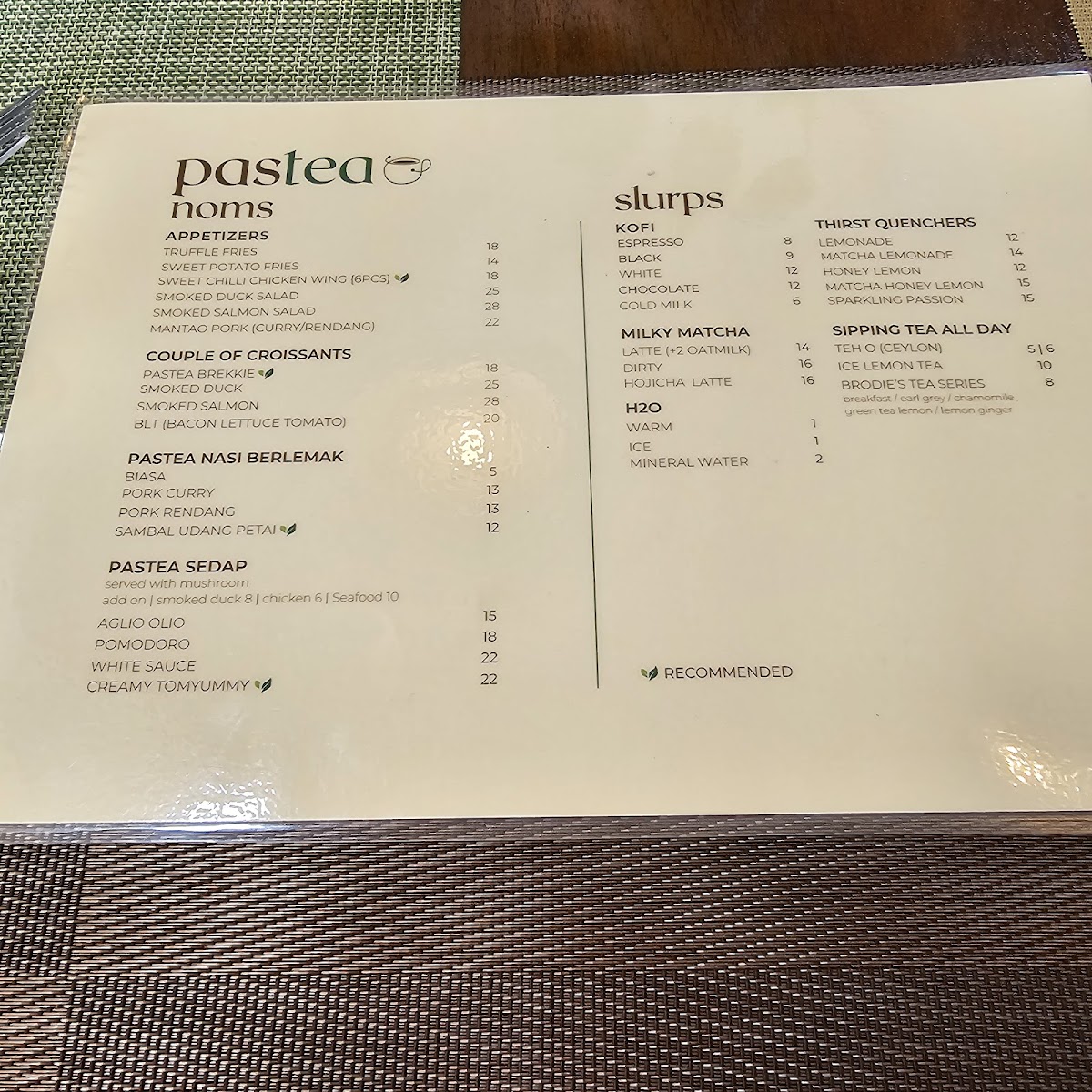 - Food: The menu features traditional Nasi Lemak options served with various accompaniments such as pork curry, pork rendang, prawn sambal with petai, and marinated yogurt chicken. There are also light bites and starters including garlic bread, mushroom soup with garlic bread, Pulut Panggang, curry puffs, and Nyonya Bak Chang.